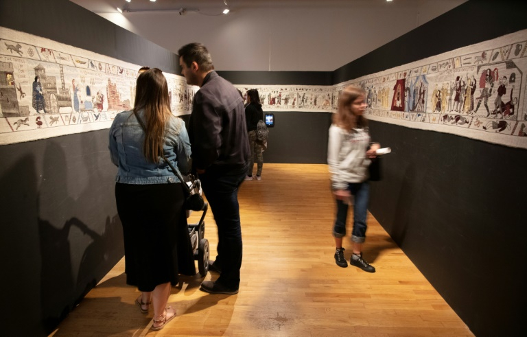 Styled in the manner of the treasured Bayeux Tapestry, which depicts the 11th-century Norman conquest of England, the completed piece will be transported to France to hang near its predecessor in September.