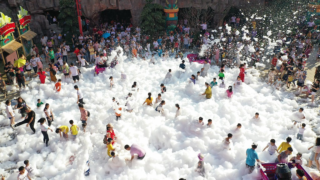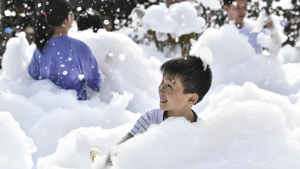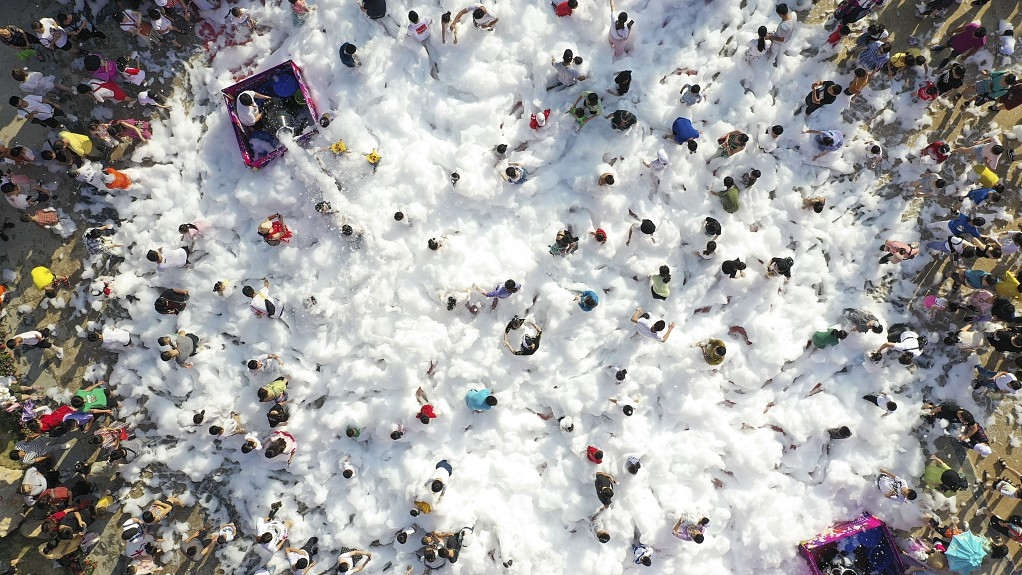 People jumped into the sea of bubbles to play with each other, caring little of what they should wear but to simply enjoy the rare coolness in the intense heat of summer. /VCG Photo