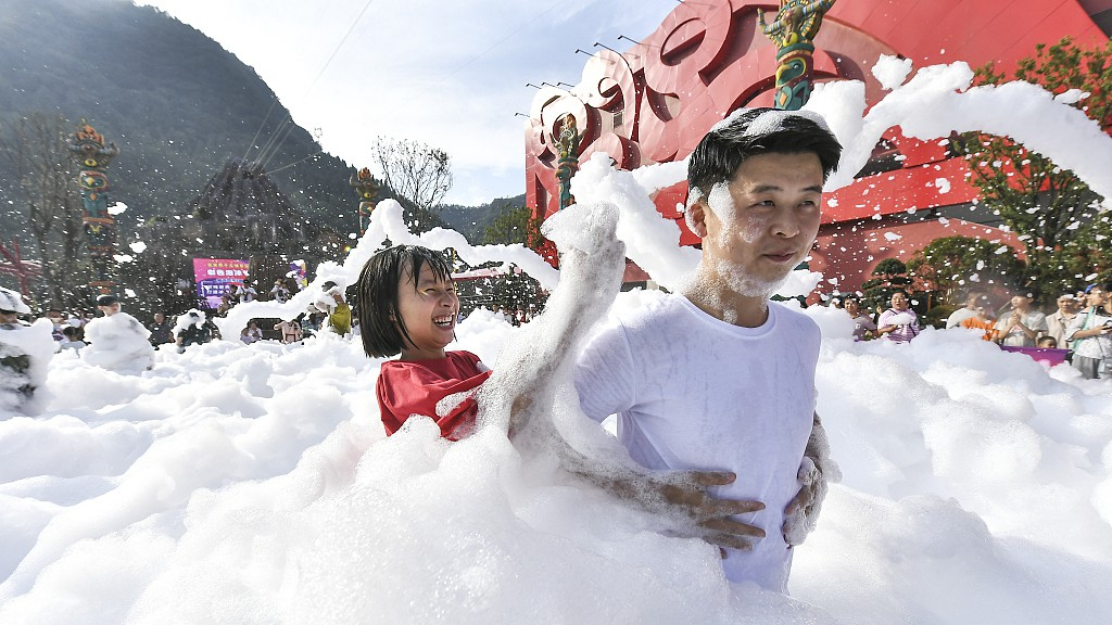 The foam run held by the Qianguqing Scenic Spot in Zhangjiajie attracted many children and tourists to jump into the foams having fun on Friday. /VCG Photo