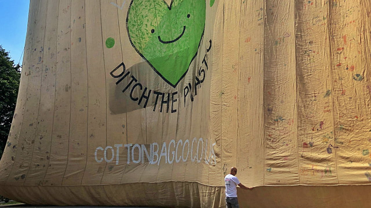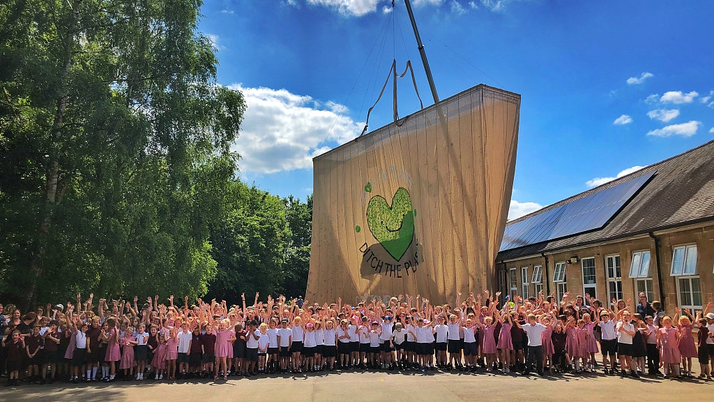 A jute bag that could fit two million bottles of water smashed a Guinness World Record after it was hoisted at a primary school in Bradford-on-Avon, UK. /VCG Photo