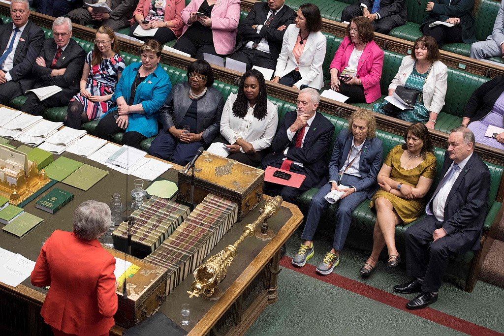 Britain's opposition Labour Party Leader Jeremy Corbyn (4R) sit with members of his front bench as Britain's Prime Minister Theresa May speaks during the weekly Prime Minister's Questions (PMQs) question and answer session in the House of Commons in London on May 15, 2019. /VCG Photo