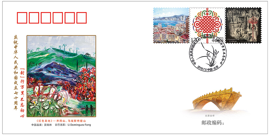 The one on the China-Cuba commemorative envelope was a co-work of Chinese artist Wu Xiaolin and Cuban artist Li Dominguez Fong. Titled Red Mecca, it features the Jinggang Mountains and the Sierra Maestra with azalea and pansy flowers in a riot of colors, symbolizing the two countries’ revolutions and struggles.