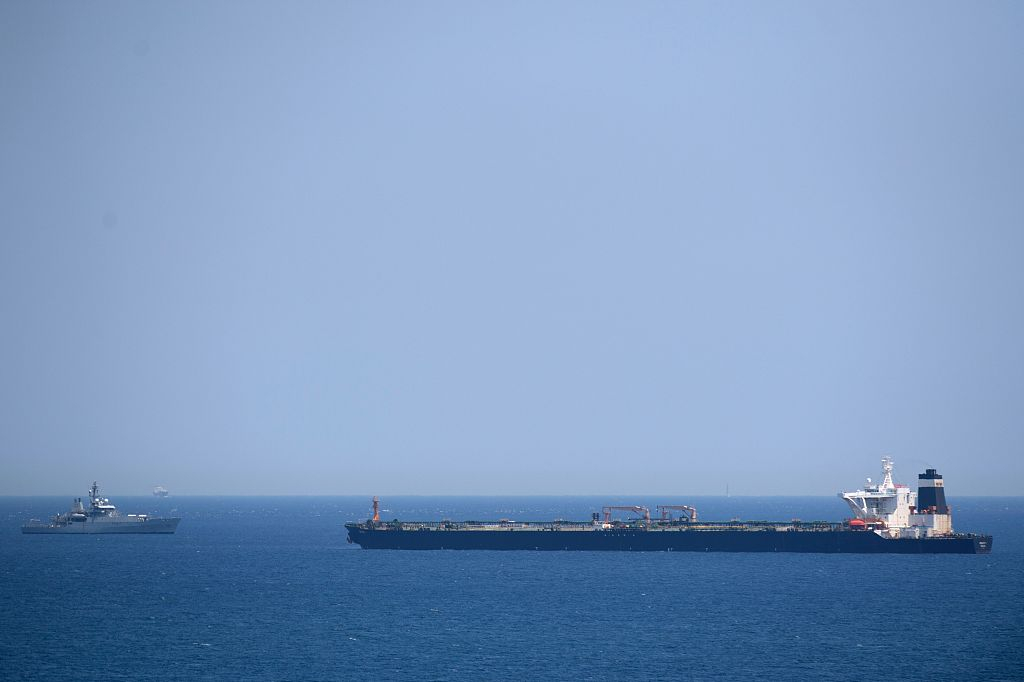 A British Royal Navy ship (L) patrols near supertanker Grace 1 suspected of carrying crude oil to Syria in violation of EU sanctions after it was detained off the coast of Gibraltar on July 4, 2019. /VCG Photo