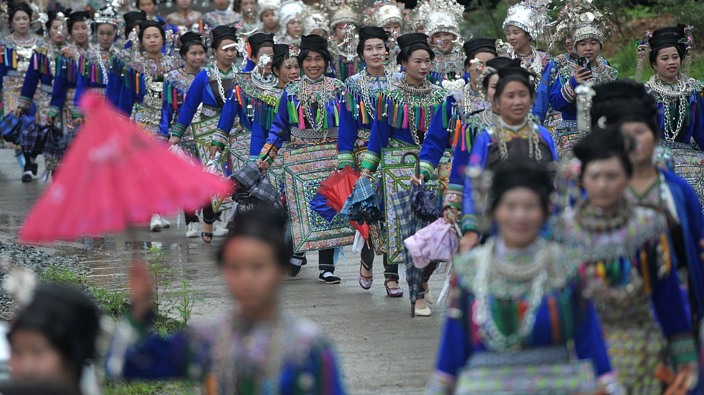 Monday marked "Liuyueliu," the sixth day of the sixth month of the Chinese lunar calendar and an auspicious date for many Chinese. People of the Dong ethnicity in southwest China's Guizhou Province gathered in traditional costumes to celebrate the Liuyueliu Festival (or June 6 Festival). /VCG Photo