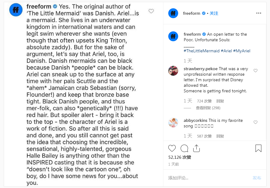 Freeform posted an open letter on Sunday in support of Bailey after some on social media used the hashtag #NotMyAriel to object to a black woman portraying the red-headed mermaid princess of the animated film.