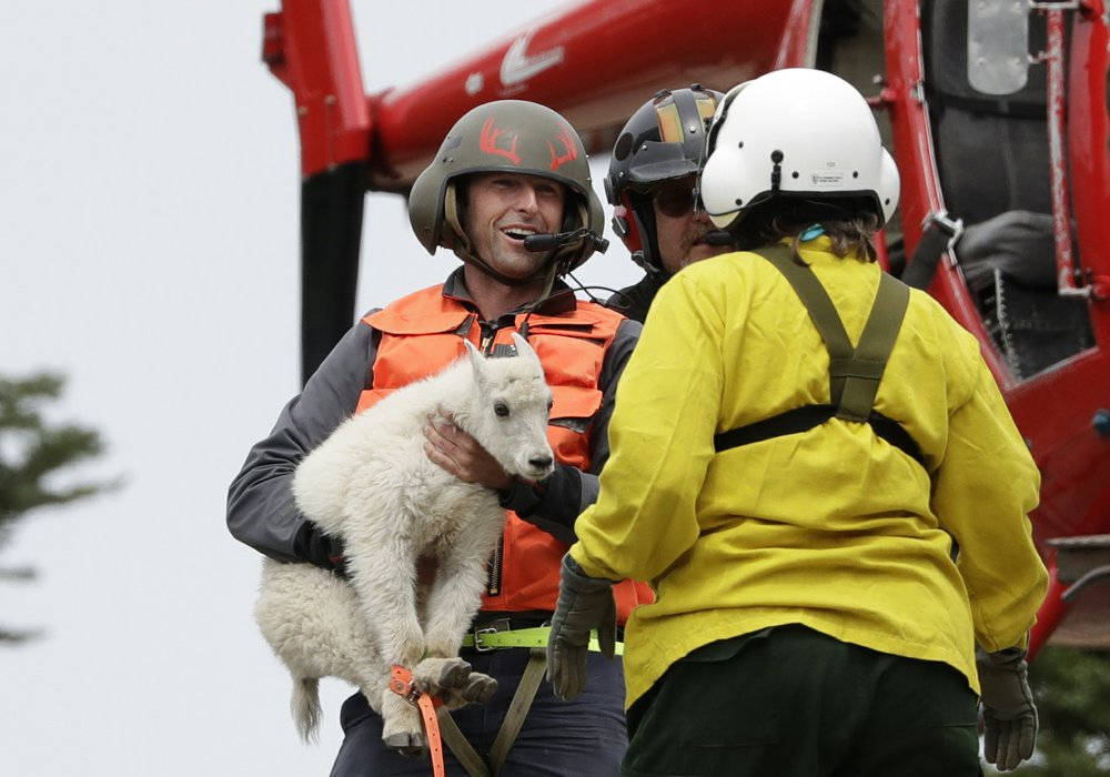 "Mugger" Derrick Halsey hands off a kid mountain goat to Olympic National Park Wildlife Branch Chief Patti Happe Tuesday, July 9, 2019. after airlifting the goat and two others to Hurricane Ridge near Port Angeles, Wash. /AP Photo