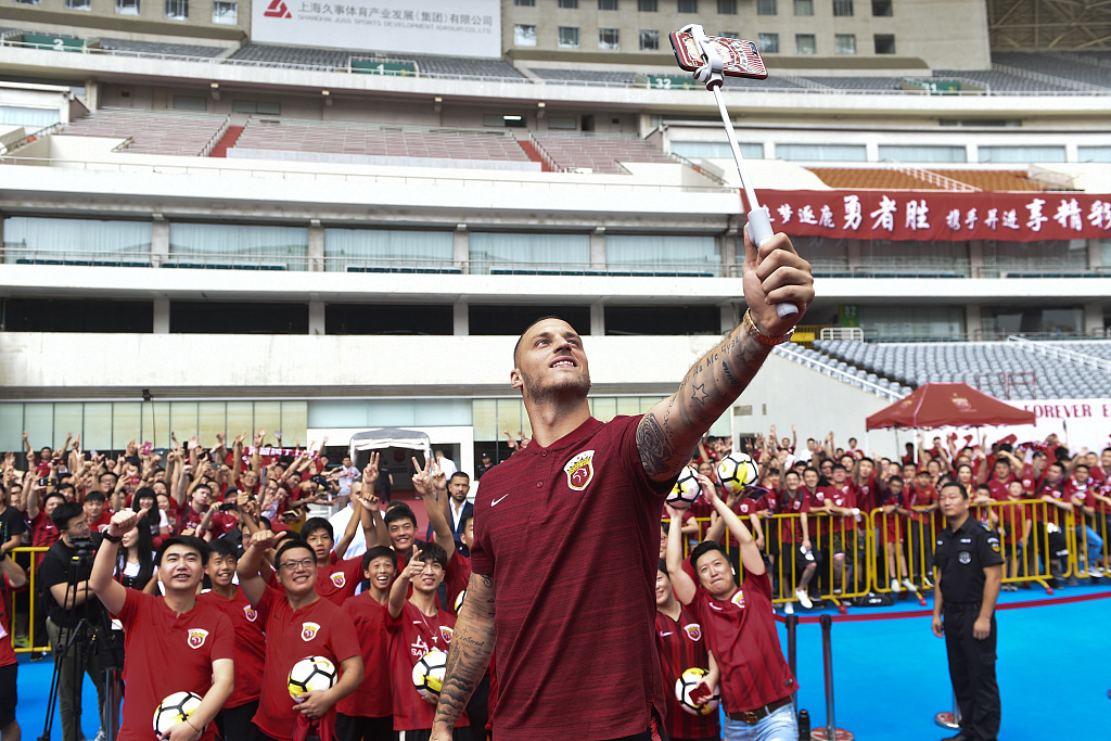 Marko Arnautovic takes a selfie with Shanghai SIPG fans, Shanghai, China, July 11, 2019. /VCG Photo