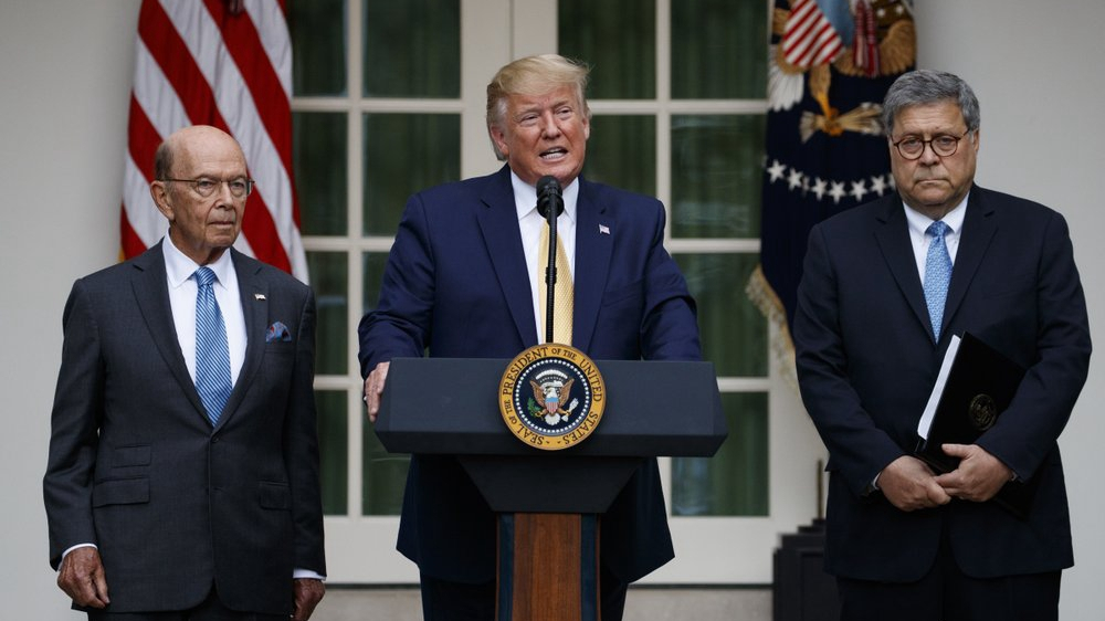 President Donald Trump, joined by Commerce Secretary Wilbur Ross(L) and Attorney General William Barr, speaks during an event about the census in the Rose Garden at the White House in Washington, D.C., July 11, 2019. /AP Photo