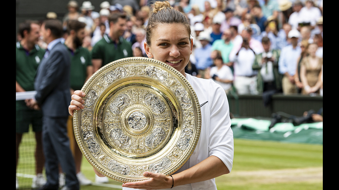 Simona Halep of Romania holds her first Wimbledon championship trophy after defeating American Serena Williams in London, UK, July 13, 2019. /VCG Photo