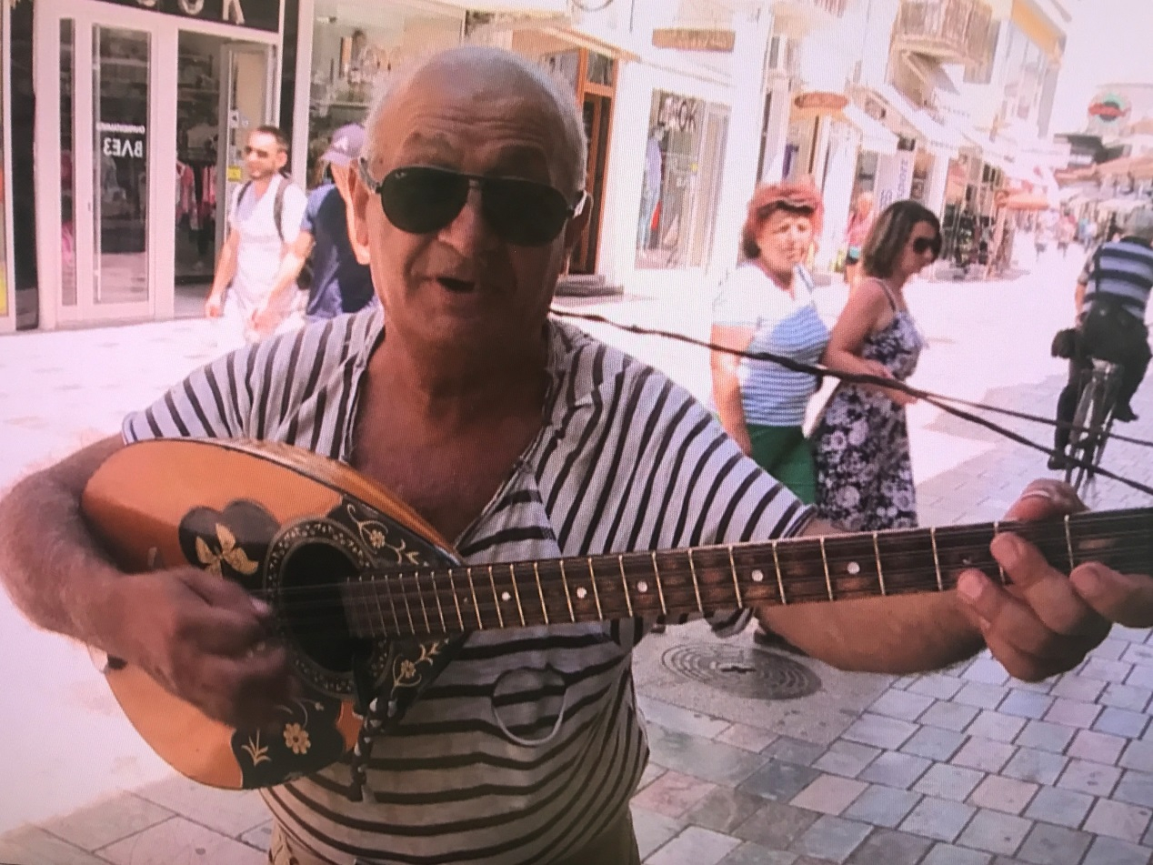 An Ohrid resident playing music on the street. /CGTN Photo