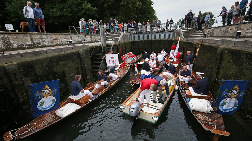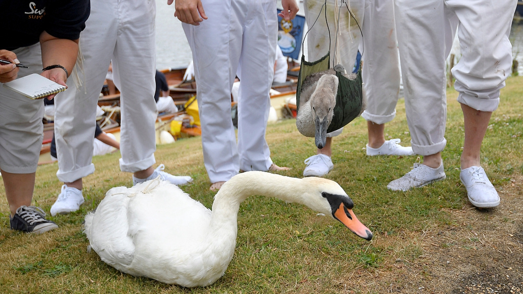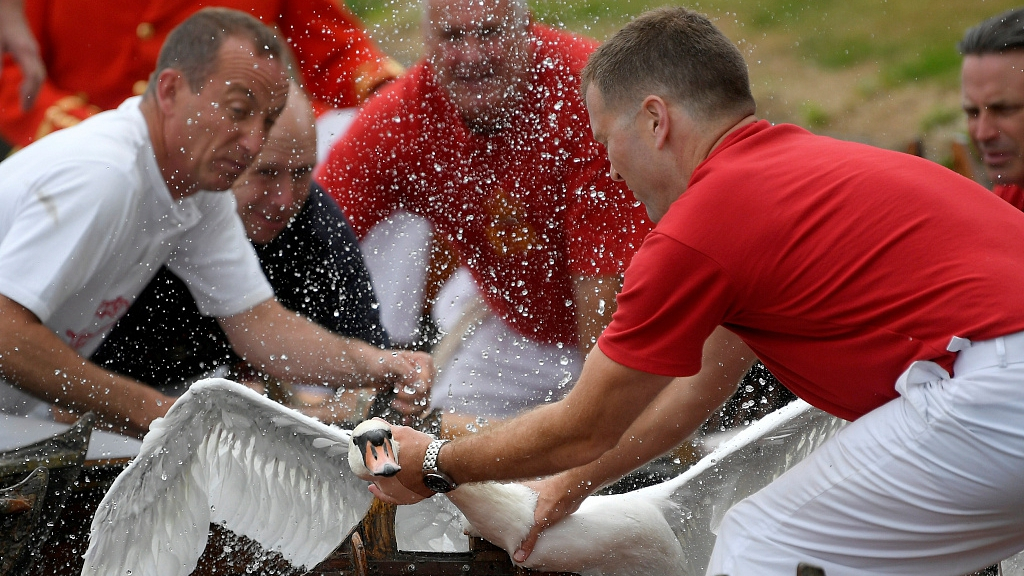 Men participate in the annual 'Swan Upping' along the River Thames in London on July 15, 2019. /VCG Photo