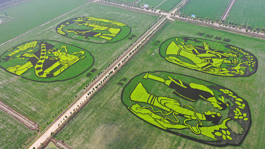 Two of four aerial photos portraying the Chinese legend "Marriage of a Fairy Princess," or Tian Xian Pei in Chinese, in a rice field in Yancheng, east China's Jiangsu Province. /VCG Photo