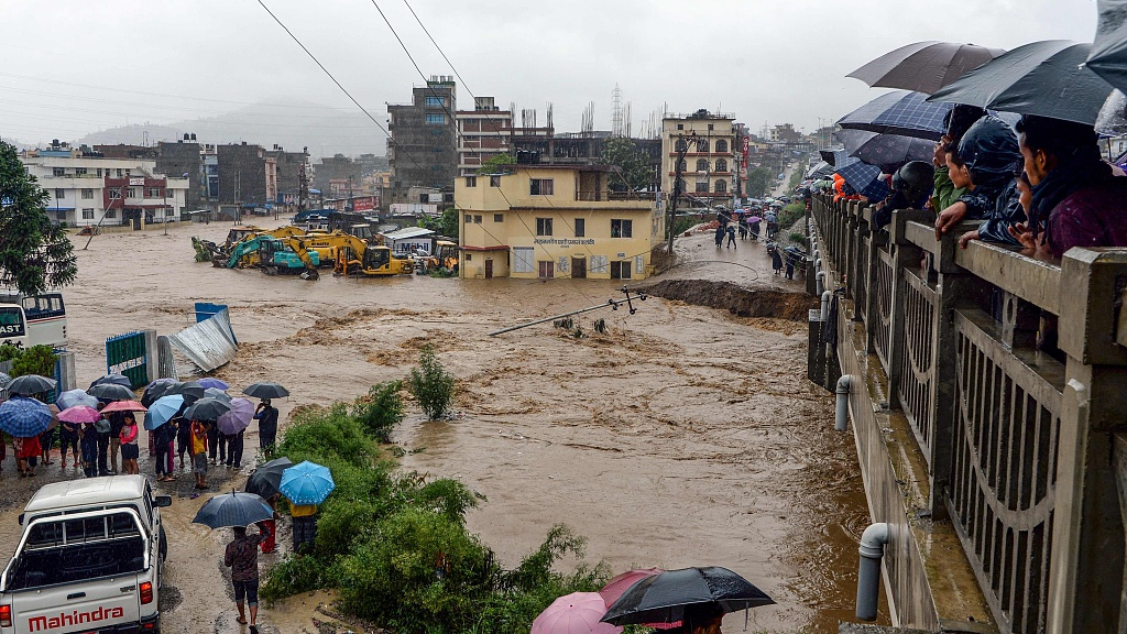 Nepali residents look at an overflowing Balkhu River, following monsoon rains at the Kalanki area of Kathmandu, July 12, 2019. /VCG Photo