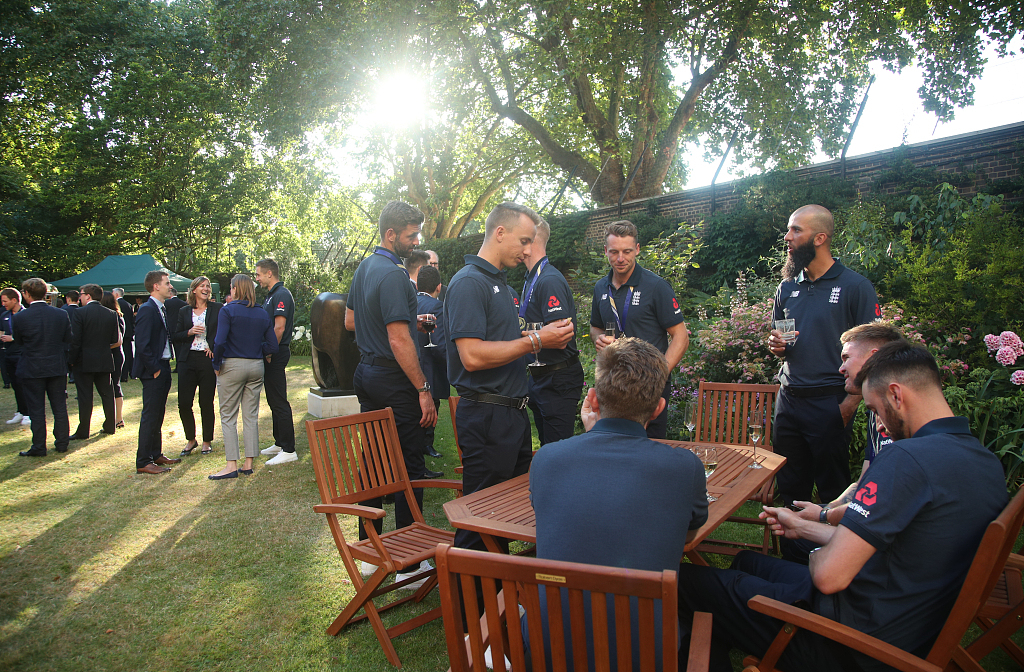 The England Cricket Team including Jos Buttler, Moeen Ali and Liam Plunkett attend a reception at Downing Street after winning the Cricket World Cup on July 15, 2019 in London, England. /VCG Photo