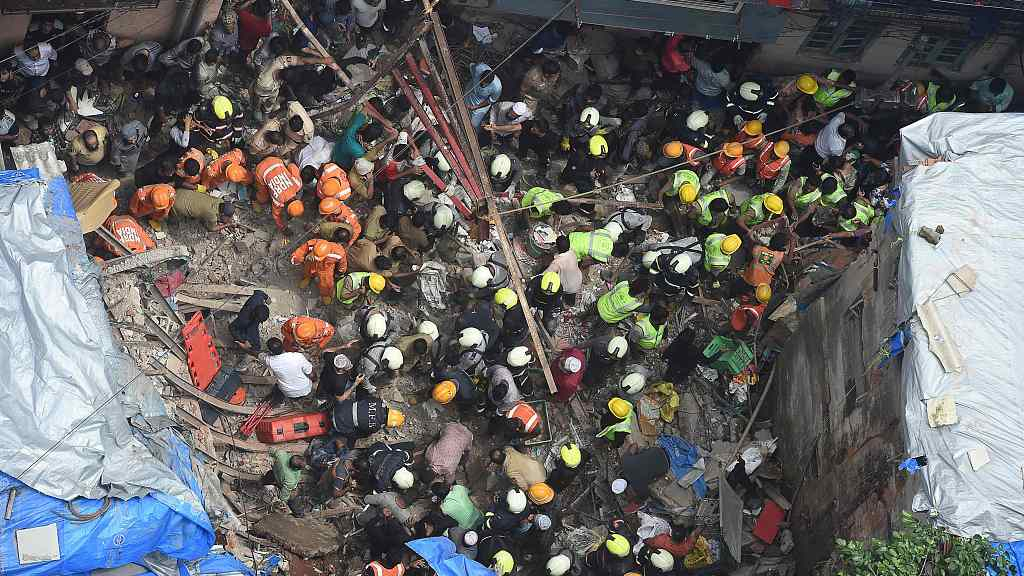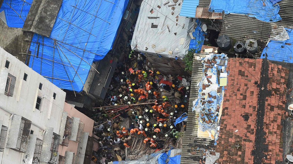 Rescue workers search for survivors at the site of a collapsed building in Mumbai, India, July 16, 2019. /VCG Photo
