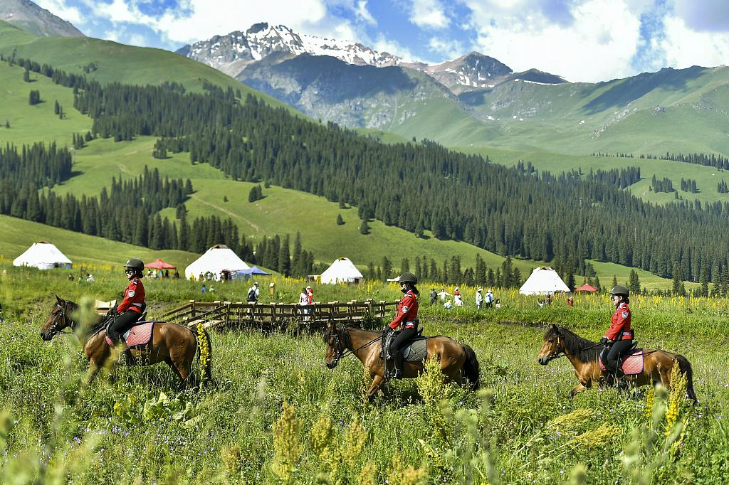 Three mounted police women are patrolling around a scenic area of Xinjiang, northwest China, July 15, 2019. /VCG Photo