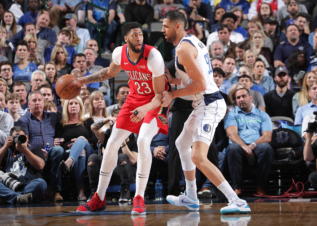 Anthony Davis #23 of the New Orleans Pelicans posts up on Salah Mejri #50 of the Dallas Mavericks in Dallas, Texas, March 18, 2019. /VCG Photo