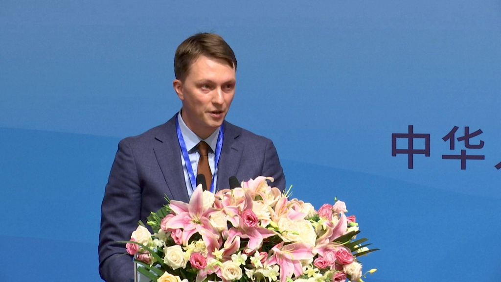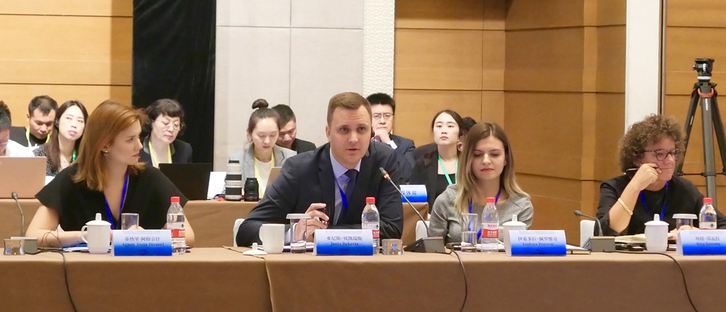 Sandris Sabajevs, press secretary to Prime Minister of Latvia, gives a speech at the dialogue. /CGTN Photo