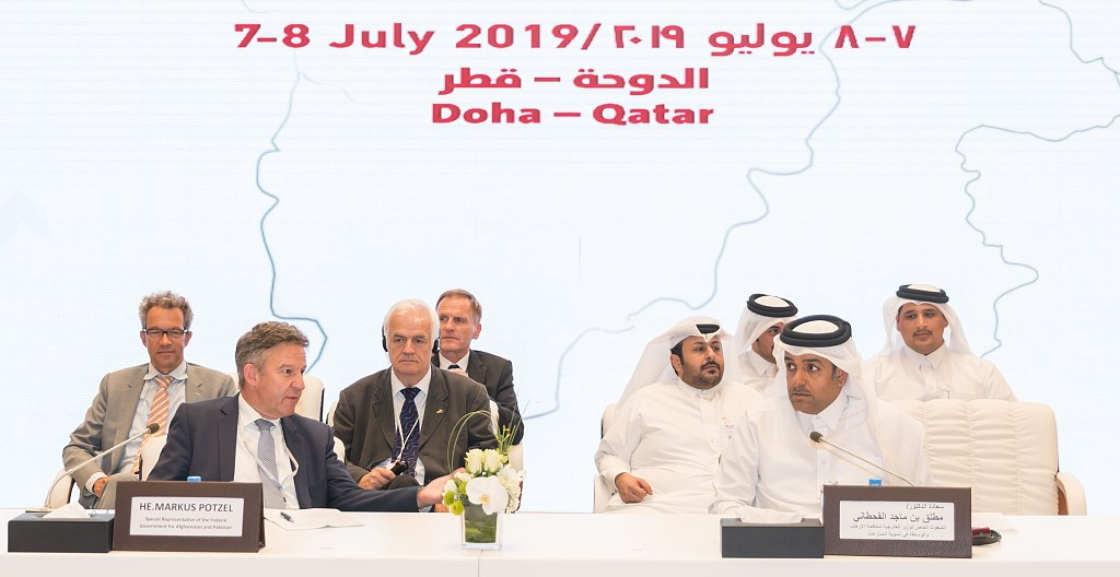 Special envoy of foreign minister of state of Qatar, Mutlaq bin Majed Al-Qahtani (R) speak at Intra-Afghan peace dialogue in Doha, Qatar, July 9, 2019. /VCG Photo