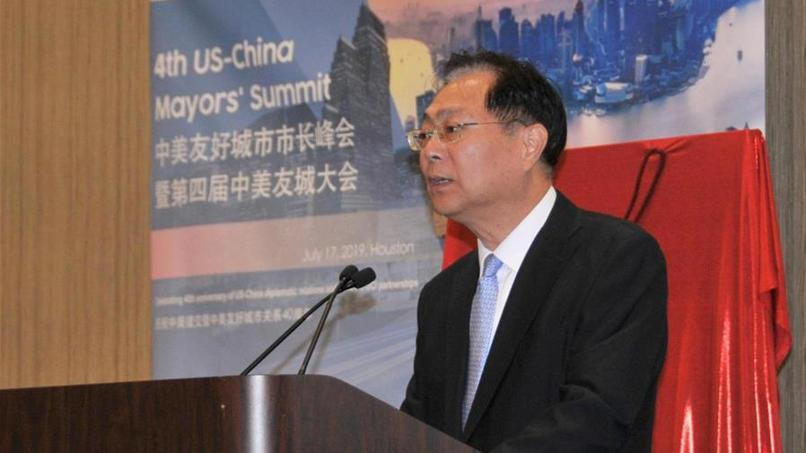 Xie Yuan, vice president of the Chinese People's Association for Friendship with Foreign Countries (CPAFFC), delivers a speech to the fourth U.S.-China Sister Cities Mayors' Summit in Houston, Texas, U.S., on July 17, 2019. /Xinhua Photo
