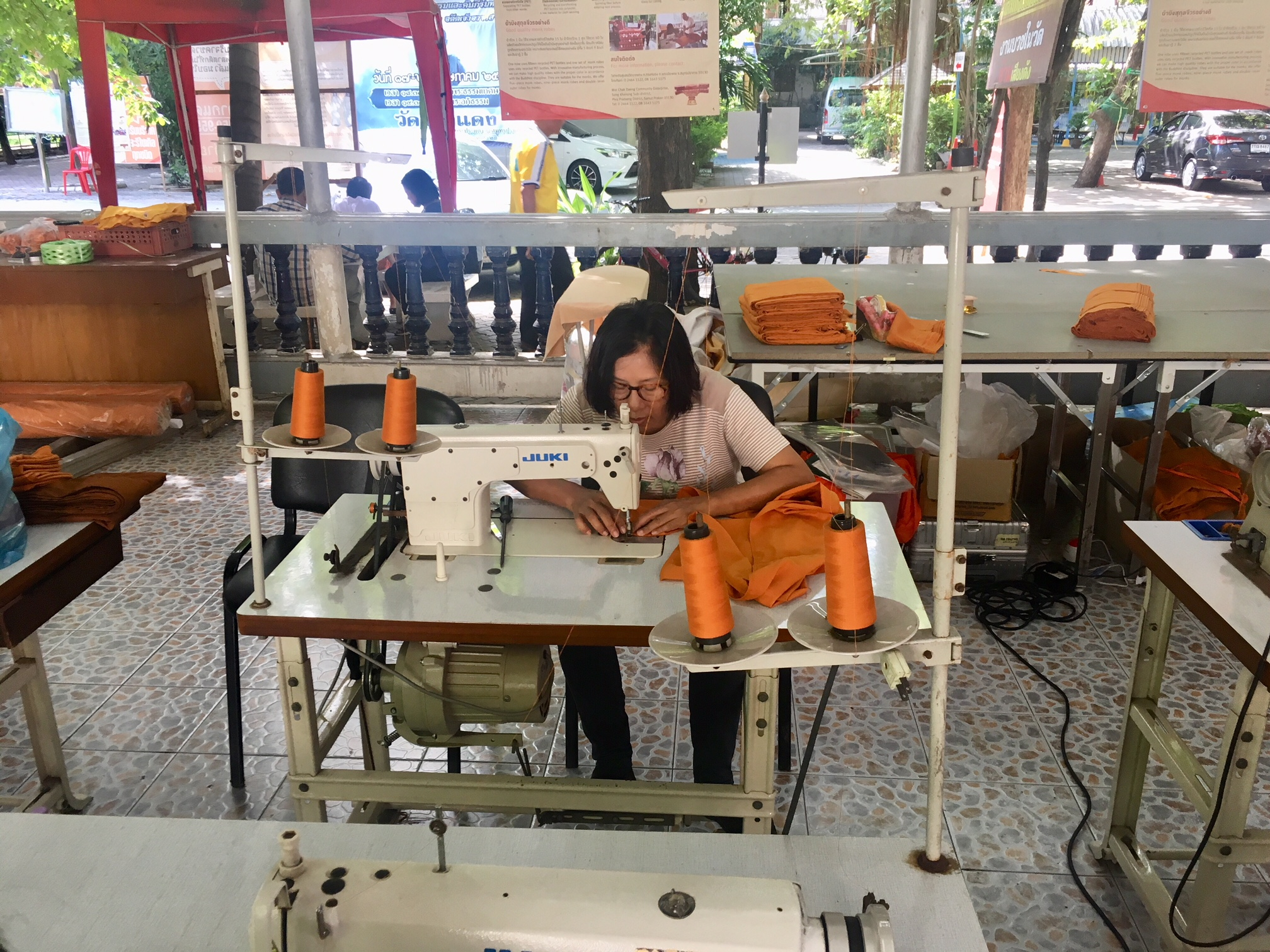 The fabric is returned to the temple to be made into robes by volunteers at a sewing workshop. Thirty percent of each finished robe comes from recycled materials.