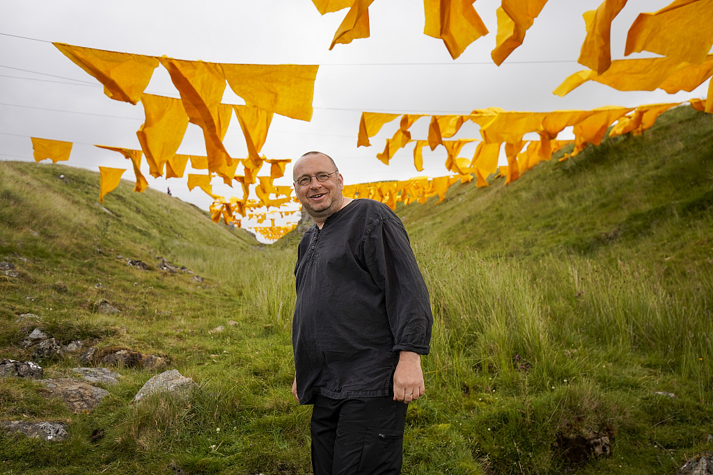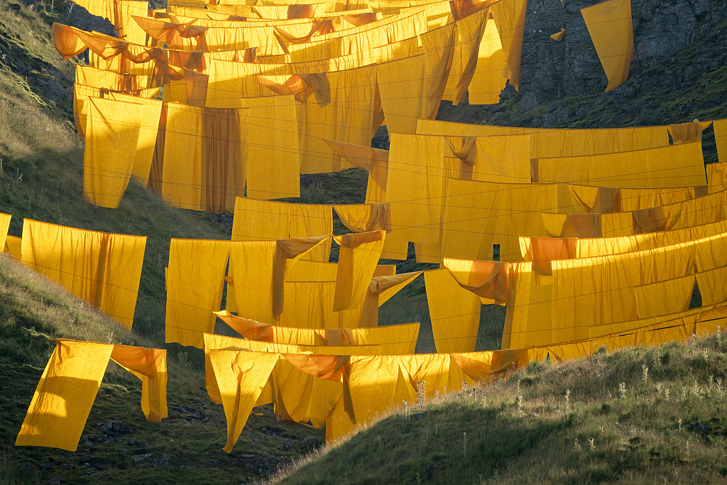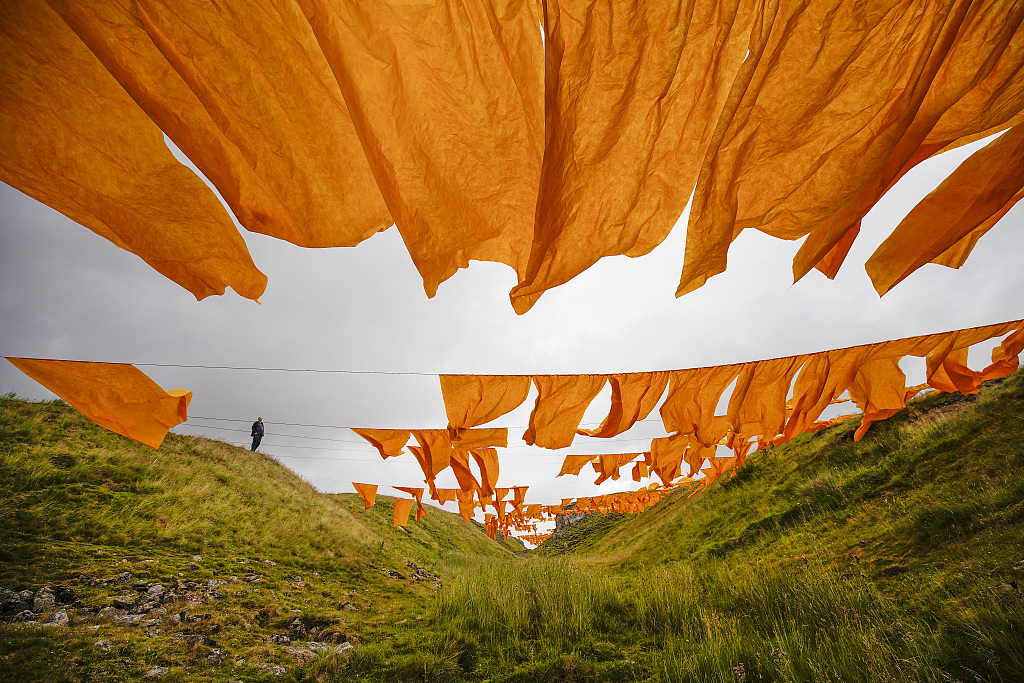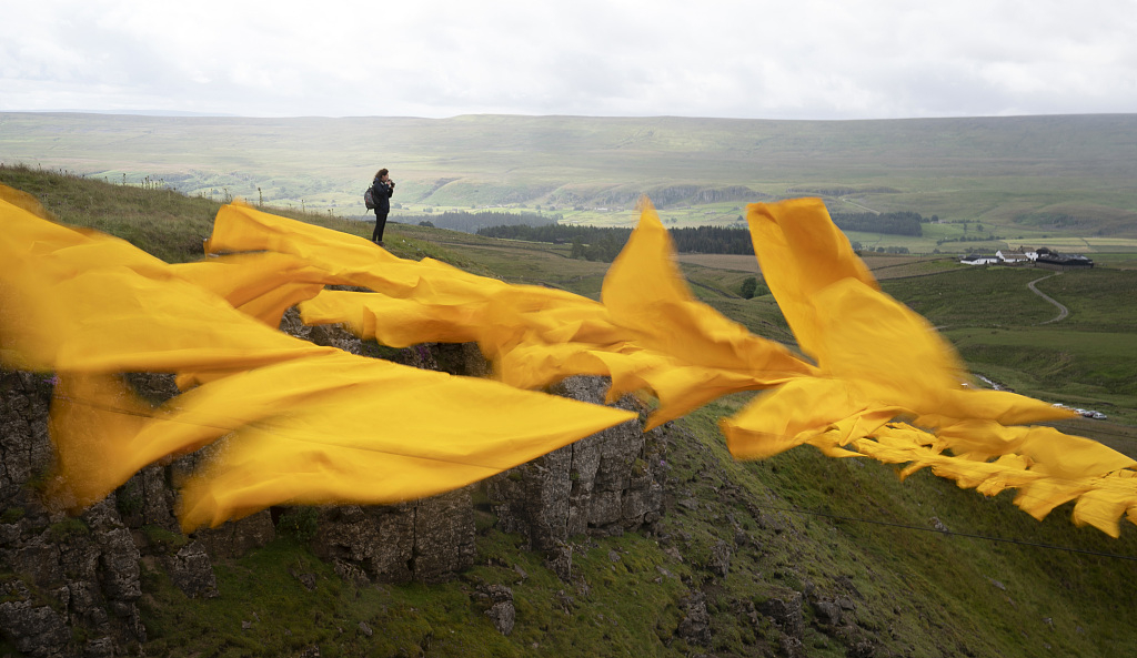 Done by landscape artist Steve Messam, hundreds of meters of recyclable saffron yellow fabric temporarily hang in Bales Hush, an old lead mining site on the Raby Estate in Upper Teesdale, England. /VCG Photo