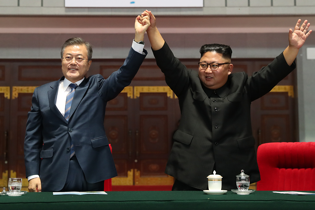 DPRK leader Kim Jong Un and ROK President Moon Jae-In after watching the large-scale gymnastic and artistic show titled "the Glorious Country" at the May Day Stadium in Pyongyang, DPRK, September 19, 2018. /VCG Photo