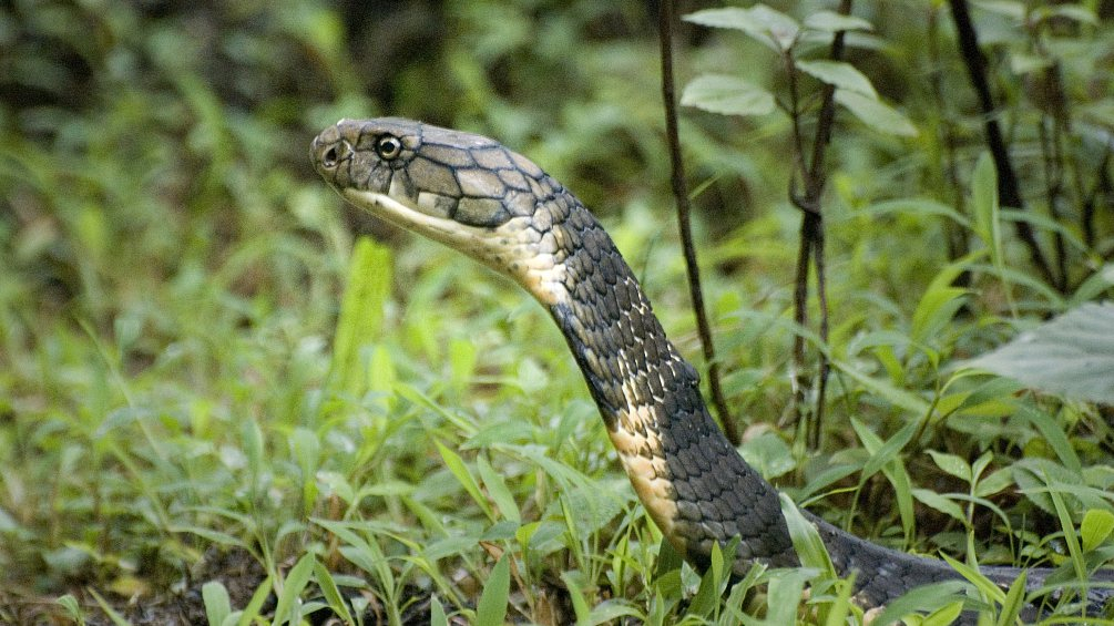 The king cobra is the longest venomous snake endemic to forests from India through Southeast Asia.