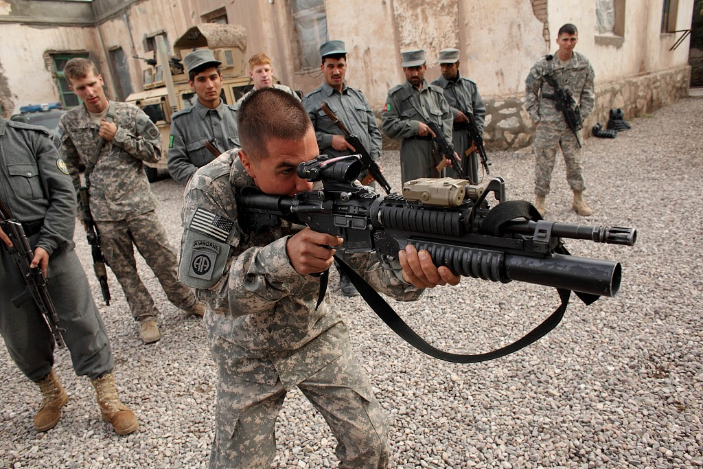 U.S. Army soldiers lead a military training exercise for Afghan National Police (ANP) officers in Herat, Afghanistan, March 9, 2010. /VCG Photo