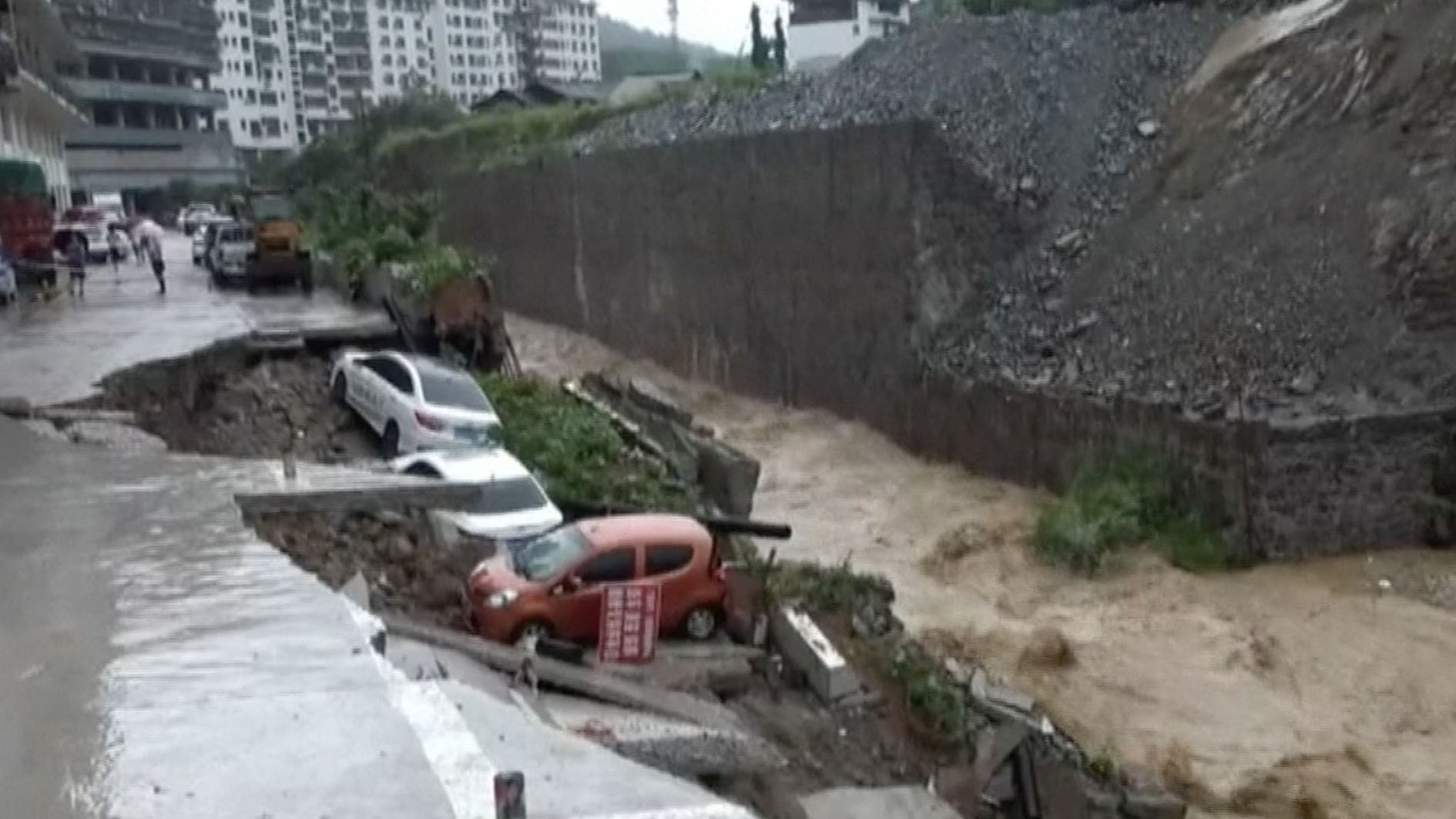 Torrential rain over the past few days continued to hit many areas in southwest China's Guizhou Province, sweeping away cars, causing major flooding and damaging roads. Local authorities began evacuating residents and dispatching workers to pump away water, clear sludge and dredge the road.