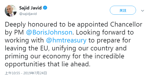 He replaces Philip Hammond, who quit hours earlier after repeatedly condemning Johnson's "no deal" threats and warning of the dire economic consequences if they are enacted.