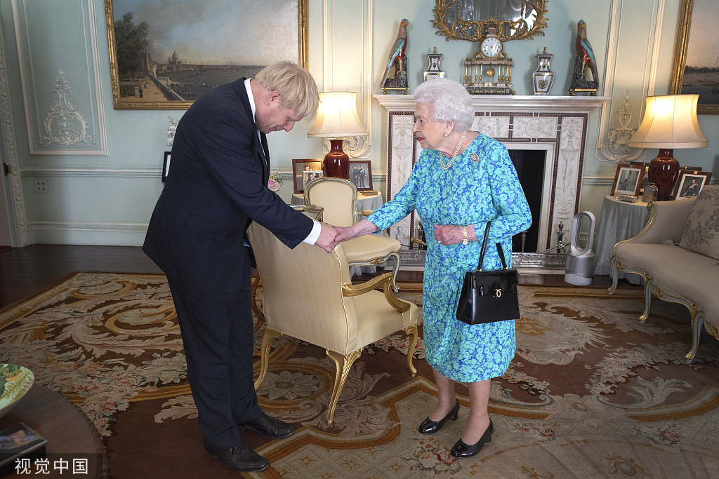 Queen Elizabeth II welcomes newly elected leader of the Conservative party Boris Johnson during an audience in Buckingham Palace, London, where she invited him to become Prime Minister and form a new government on July 24, 2019. /VCG Photo