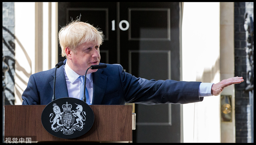Prime Minister Boris Johnson arrives in Downing Street and delivers a speech before entering No.10 on July 25, 2019. /VCG Photo