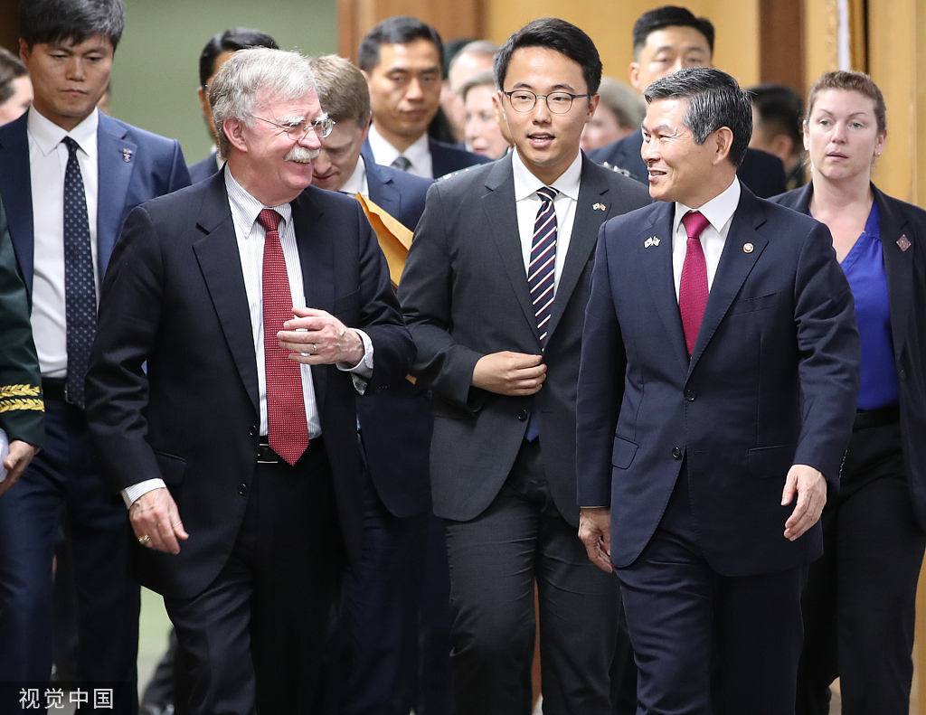 U.S. national security adviser John Bolton talks to ROK's Defense Minister Jeong Kyeong-doo in Seoul, on July 24, 2019. /VCG Photo