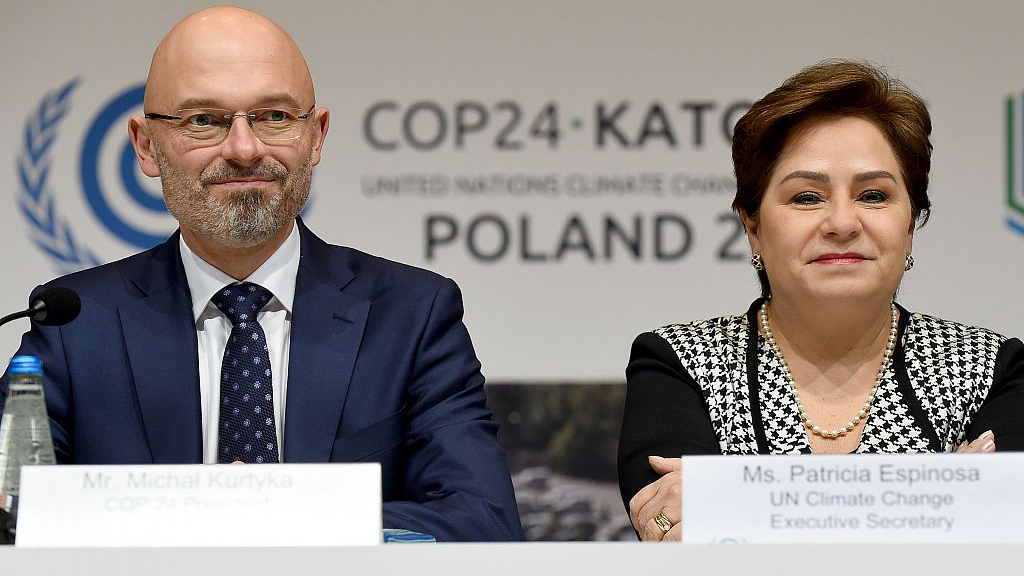 Polish Secretary of State in the Ministry of Environment, Government Plenipotentiary for COP24 Presidency, Michal Kurtyka (L) and Mexican Executive Secretary of United Nations Framework Convention on Climate Change Patricia Espinosa, give a press conference during the 24th Conference of the Parties to the United Nations Framework Convention on Climate Change (COP24) summit in Katowice, Poland, December 2, 2018. /VCG Photo