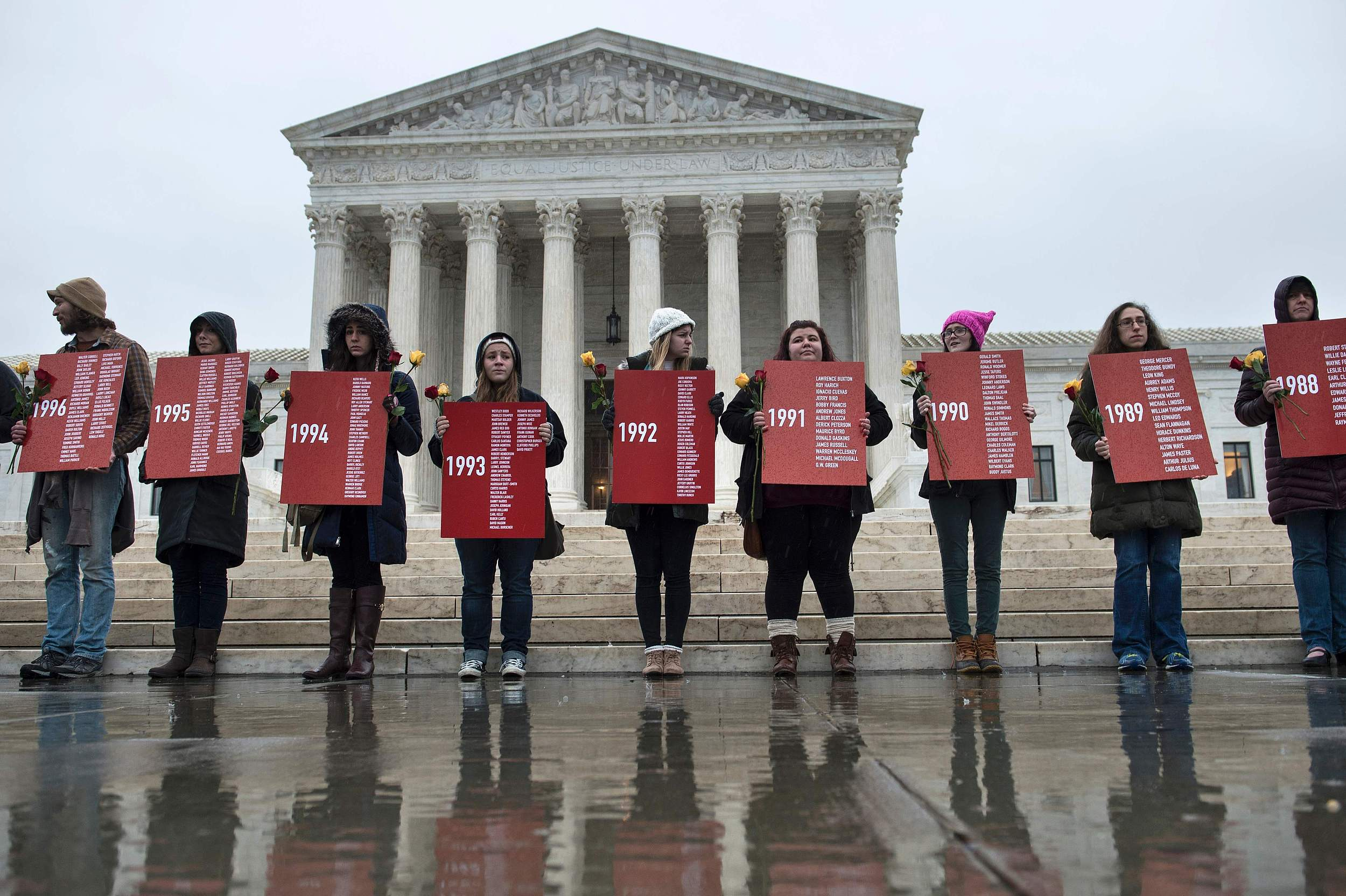 Activists hold signs with the names of people executed in the United States since 1977 during an anti-death penalty protest in front of the U.S. Supreme Court in Washington, D.C., January 17, 2017. /VCG Photo