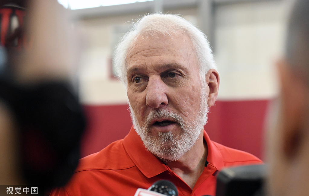 Head coach Gregg Popovich of the United States is interviewed during a practice session at the 2018 USA Basketball Men's National Team minicamp on July 26, 2018 in Las Vegas, Nevada. /VCG Photo