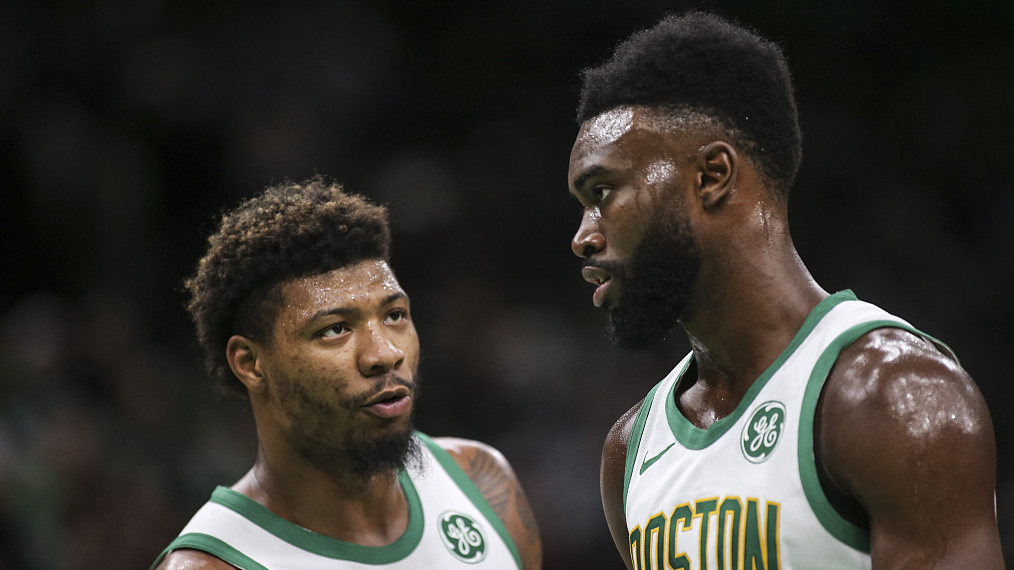 Boston Celtics guard Marcus Smart (L) speaks with Celtics forward Jaylen Brown (R) during a regular season NBA basketball game on March 1, 2019. /VCG Photo