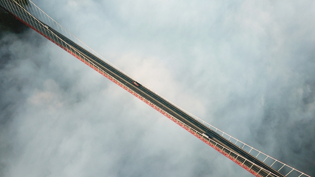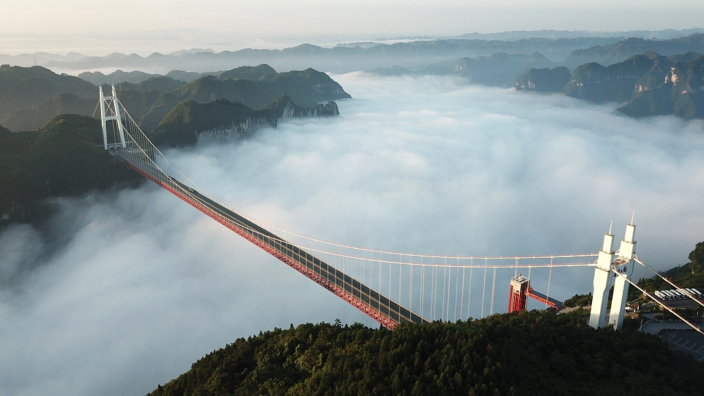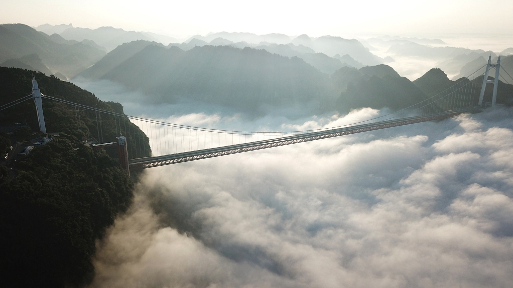 Aizhai Bridge, a suspension bridge on the Baotou-Maoming Expressway in the central Chinese city of Jishou, is shrouded in a sea of clouds, offering motorists a breathtaking view on Saturday. /VCG Photo