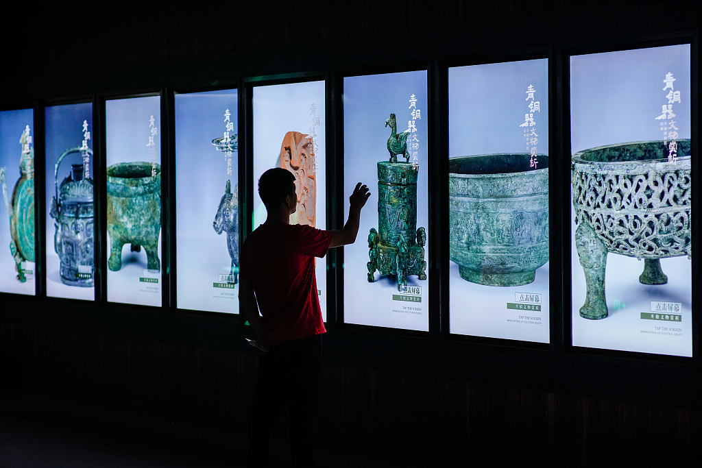 A visitor look at the interactive screen in the Shanxi Bronze Museum. /VCG Photo