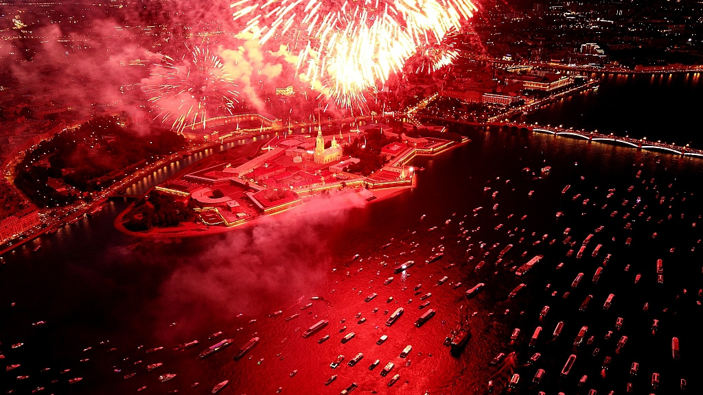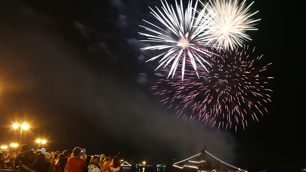 Spectators in Russia's second largest city of St. Petersburg were treated to impressive fireworks as Navy Day celebrations wrapped up on Sunday, July 28, 2019. /VCG Photo