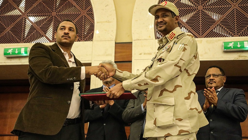 (Cover image: Sudanese deputy chief of the ruling military council Mohamed Hamdan Dagalo (R) and protest movement Alliance for Freedom and Changes leader Ahmad al-Rabiah stand after inking an agreement before African Union and Ethiopian mediators in Khartoum, July 17, 2019. /VCG Photo)