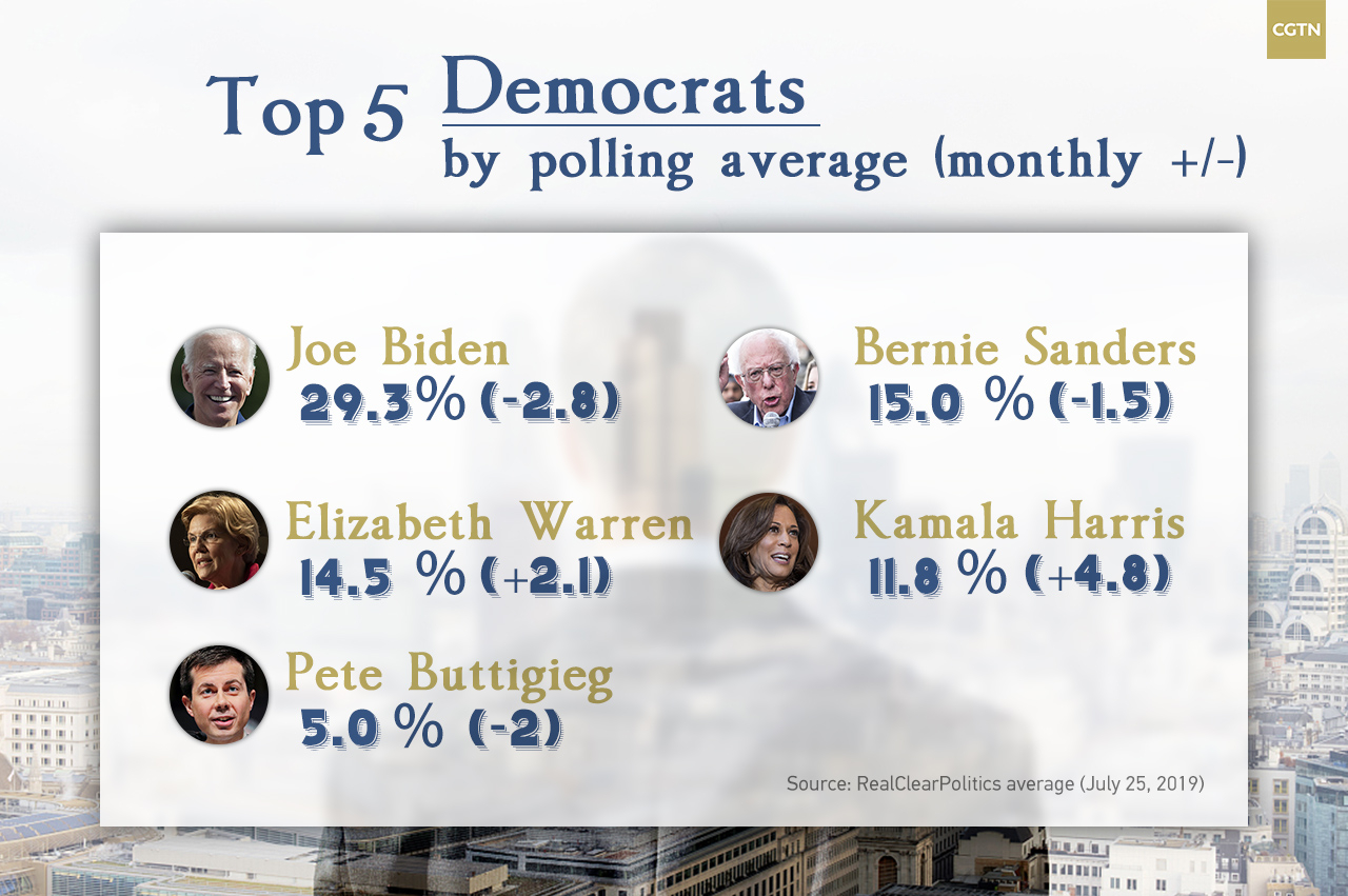 Top of the average polling table is former vice president Joe Biden, who has rebounded after a tough encounter with California Senator Kamala Harris in the first debates. The 76-year-old had a flat first outing, and despite his poll lead will be under pressure to show he is capable of standing toe-to-toe with his rivals in the spotlight.