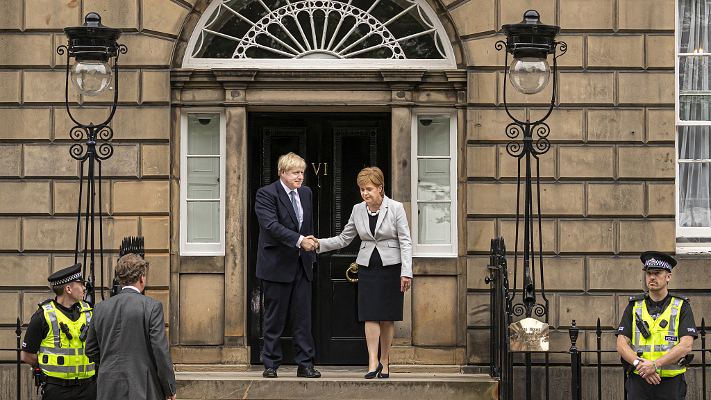 UK Prime Minister Boris Johnson shakes hands with Scotland's First Minister Nicola Sturgeon at Bute House in Edinburgh, Scotland, July 29, 2019. /VCG Photo