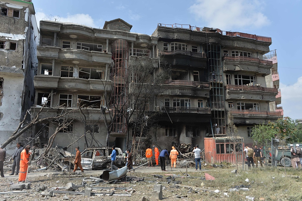 Afghan security forces and municipality workers gather at the site of an attack in Kabul on July 29, 2019, a day after a deadly assault targeting a political campaign office. /VCG Photo