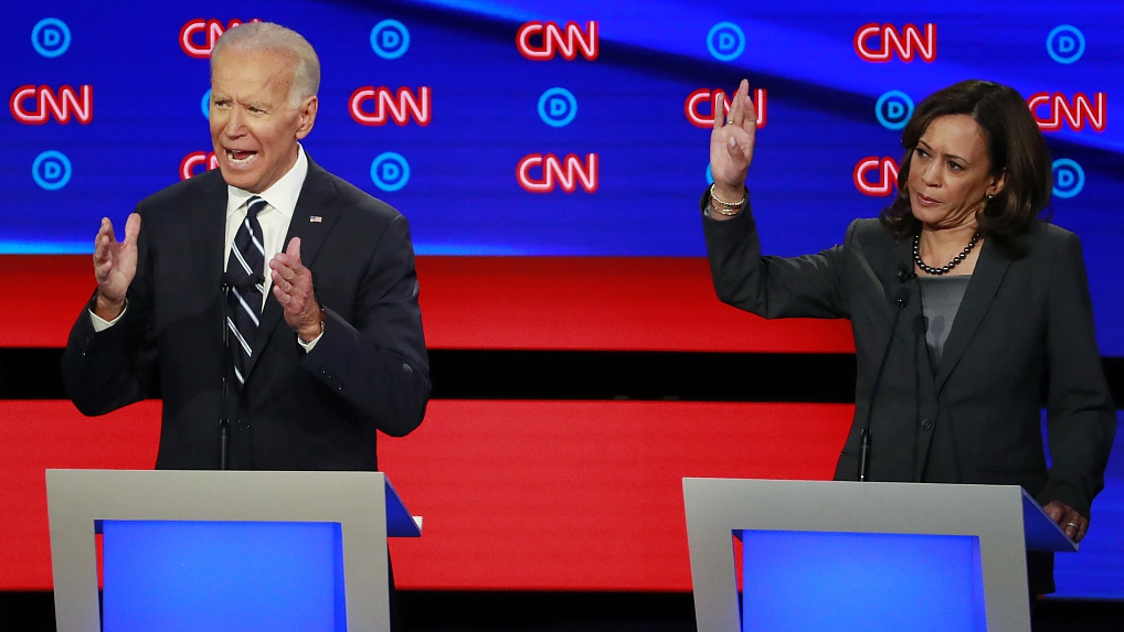 Former vice president Joe Biden and Senator Kamala Harris on the second night of the second 2020 Democratic U.S. presidential debates in Detroit, Michigan, July 31, 2019. /VCG Photo