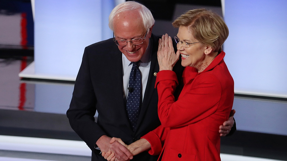 Senators Bernie Sanders and Elizabeth Warren on the first night of the second 2020 Democratic U.S. presidential debates in Detroit, Michigan, July 30, 2019. /VCG Photo