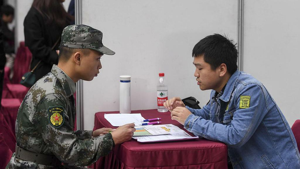 A Chinese veteran is attending an employment interview in Changsha, central China's Hunan Province, November 27, 2018. /VCG Photo