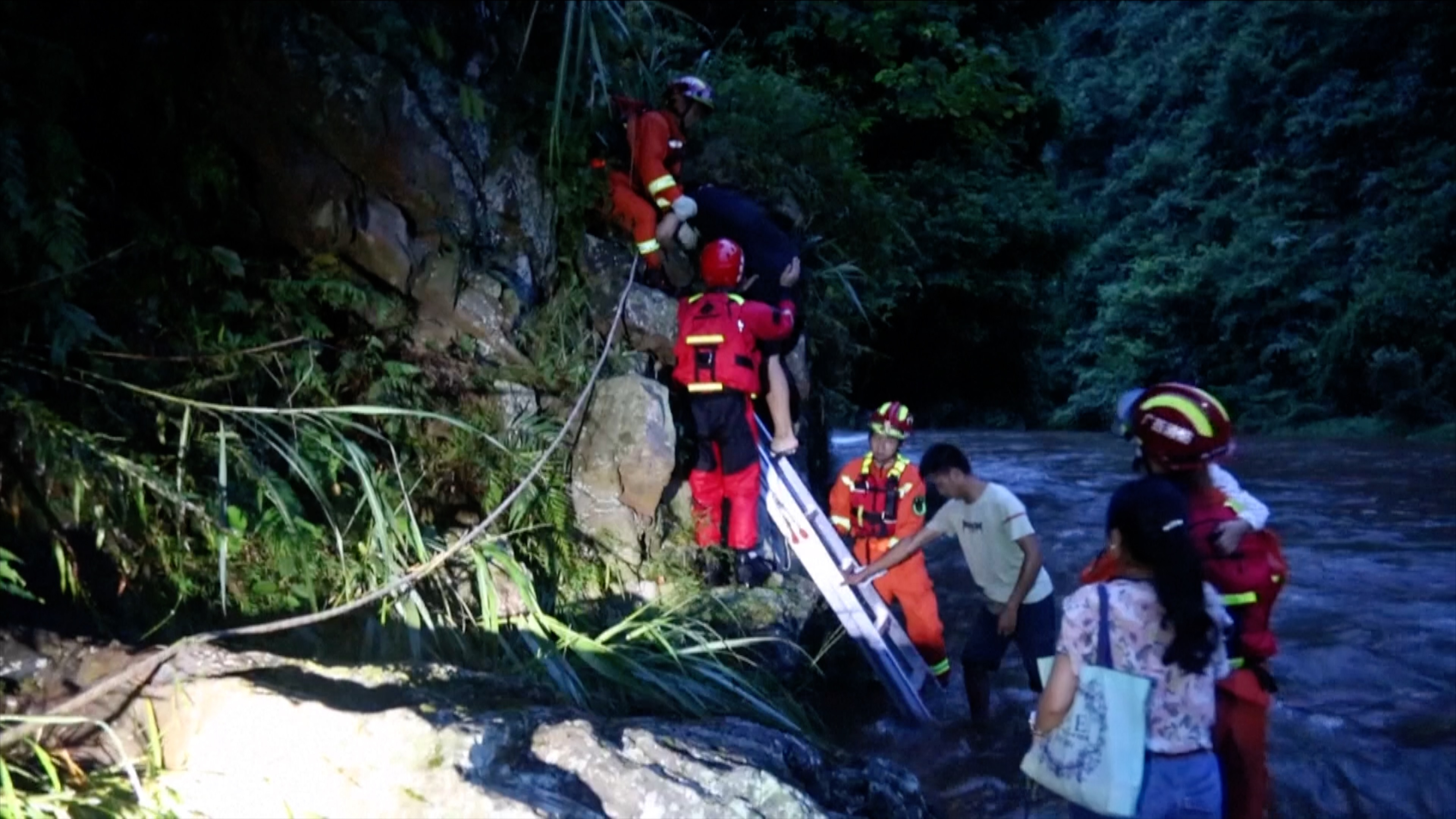 Thirty-seven tourists were trapped by heavy rain in Nanning City, south China's Guangxi Zhuang Autonomous Region, on Thursday. Every single one of them was saved after strenuous efforts by local firefighters. Wipha, the seventh typhoon this year, triggered a rainstorm in Shanglin County, Nanning City, causing rivers to overflow.