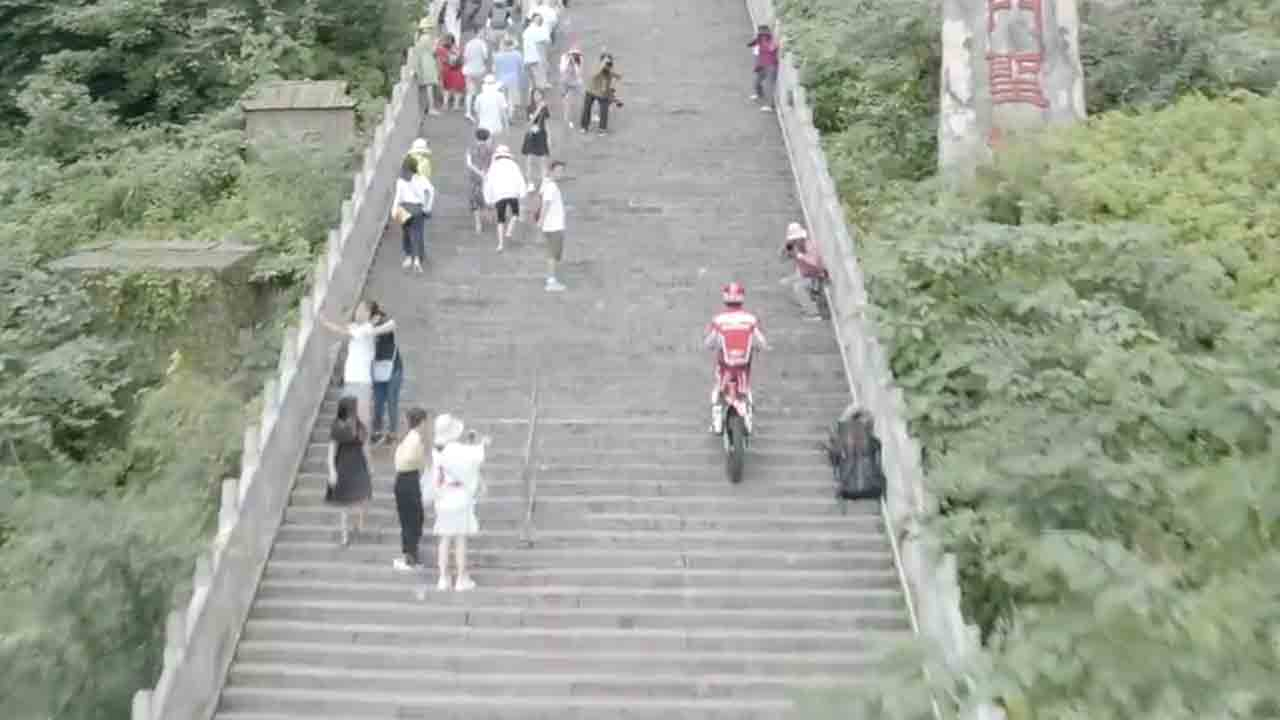 A 33-year-old motorbike rider completed an incredible stunt. He took just 56 seconds to drive up the "Sky Ladder" on Tianmen Mountain in central China‘s Hunan Province. He set two world records for motorbike climbing: one for the longest distance and one for the steepest angle.